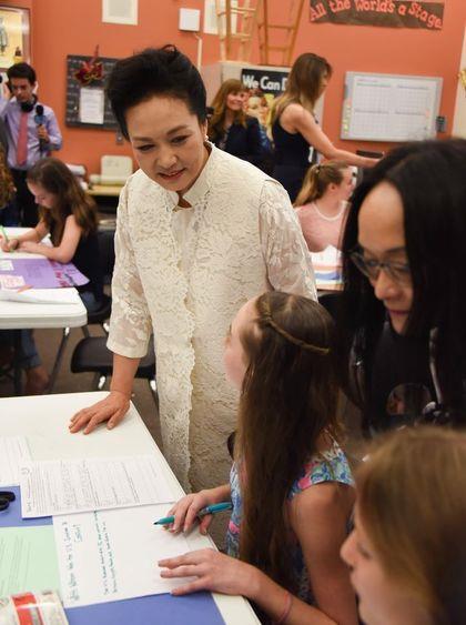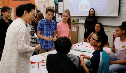 彭丽媛参观佛州贝克艺术中学 与华裔男孩用普通话交谈