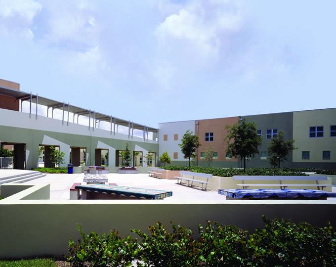 贝克艺术学校校园 两国第一夫人的车队在当地时间上午11点左右进入学校, 梅拉尼娅陪同彭丽媛到不同的音乐教室参观,欣赏学生乐队的演奏,以及由80名女学生组成的女子合唱团的表演。