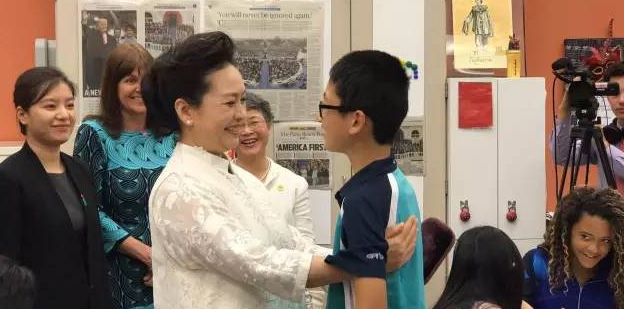 许多当地华人也早早在学校门口等待,欢迎彭丽媛。