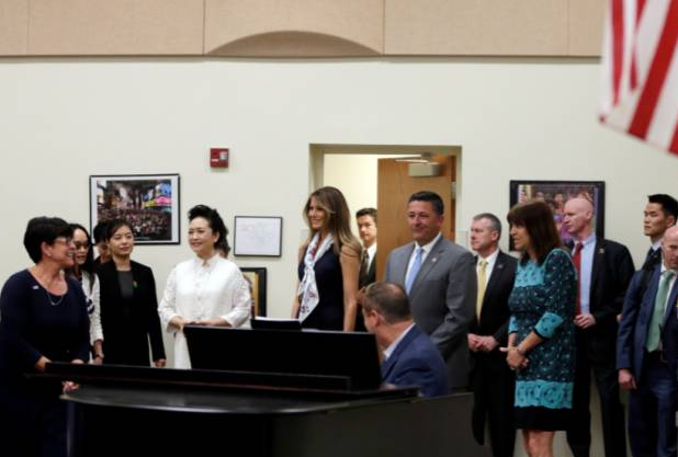 在学校参观期间,梅拉妮娅陪着彭丽媛到不同的音乐教室参观。 据悉,彭丽媛和梅拉尼娅在学校参观了四间教室,前三项分别是观看学校女生合唱团、交响乐团、和管弦乐团的表演。 她们饶有兴趣地看完演出,还与孩子们交谈,问他们“你们练习了多久”“以后想要做什么”等等。