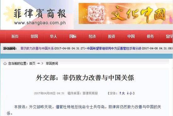 《菲律宾商报》4月8日报道称,菲外交部7日表示,尽管总统杜特尔特“命令士兵夺岛”,菲律宾仍然致力改善与中国的关系。 菲律宾外交部发言人傅查理表示:“总统正在履行他对菲律宾领土的责任。目的是改善在那些地区菲律宾人的生活条件和个人安全。......同时,我们仍然致力改善与中国和区内其他伙伴们的关系。” 《菲律宾商报》称,菲律宾外交部是在杜特尔特命令菲武装部队“占领”所有“属于菲律宾的南海岛屿”后发表上述声明。 “菲律宾总统杜特尔特下令武装部队占领‘所有属于菲律宾的南海岛礁’,并计划在独立日登中业岛”,法新社等媒体6日称,杜特尔特当天就南海争议岛屿问题发表“迄今最大胆的言论”。菲律宾总统府7日澄清表示,杜特尔特只希望菲律宾所“占据的南海领土”得到发展。 对此,中国外交部发言人华春莹7日在记者会上回应称:“中方坚定维护南海领土主权和海洋权益,坚定维护南海和平稳定。当前,南海局势总体趋稳向好,局面来之不易,值得各方共同珍惜和维护。中方注意到了有关报道,对此表示关切,希望菲方继续同中方妥善管控涉海分歧,共同维护中菲关系健康稳定发展局面。”