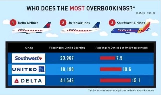 刘先生从垃圾桶里找回的登机牌碎片 在差旅乘客论坛上,一位中国网友爆料,又是因为美联航超售,他赶到东京机场才发现自己航班被取消,问美联航为什么不提前通知,美联航竟然说,我们没义务告诉你。 2015年底,还因为对残疾乘客态度恶劣,美联航被空管部门处以罚金。 02. 美联航是“超售大王” 不只是华人乘客,全世界乘客都在吐槽美联航的超售问题。 所谓超售,就是航空公司会按照飞机定员人数,再多卖一些票,以应对有人起飞前退票导致空座位,是提高收益的航空行业惯例。 虽然是行业惯例,但是超售多少比例,却是航空公司自己的问题,超售越多,当然公司的经济效益越好,但是被牺牲的乘客利益,就越多。从超售比例,能看出一个航空公司对乘客的态度。 根据MileCards.com对美国交通部数据的分析,2016年美国主要航空公司中,美联航是最有可能由于航班超售而致使已购票乘客无法登机的航企前三名。由于超售造成无法登机的比率为0.7‰,是全美国有名的超售大王。