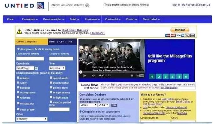 其实,写一首歌来吐槽美联航已经是很轻的惩罚了。有些人真的被美联航伤害太深,以至于多年来坚持不懈吐槽讽刺挖苦美联航。 加拿大麦吉尔大学工程学教授Jeremy Cooperstock在1996年建立了一个网站,来挖苦讽刺美联航的糟糕服务。网站不仅和美联航的官方网站域名相同,连里面的排版和设计都十分相似。美联航一直很想关闭这个“专业黑美联航”的网站,可是没有办法。最感人的是,这个网站坚持了将近20年,不断更新,真的是专业黑美联航。