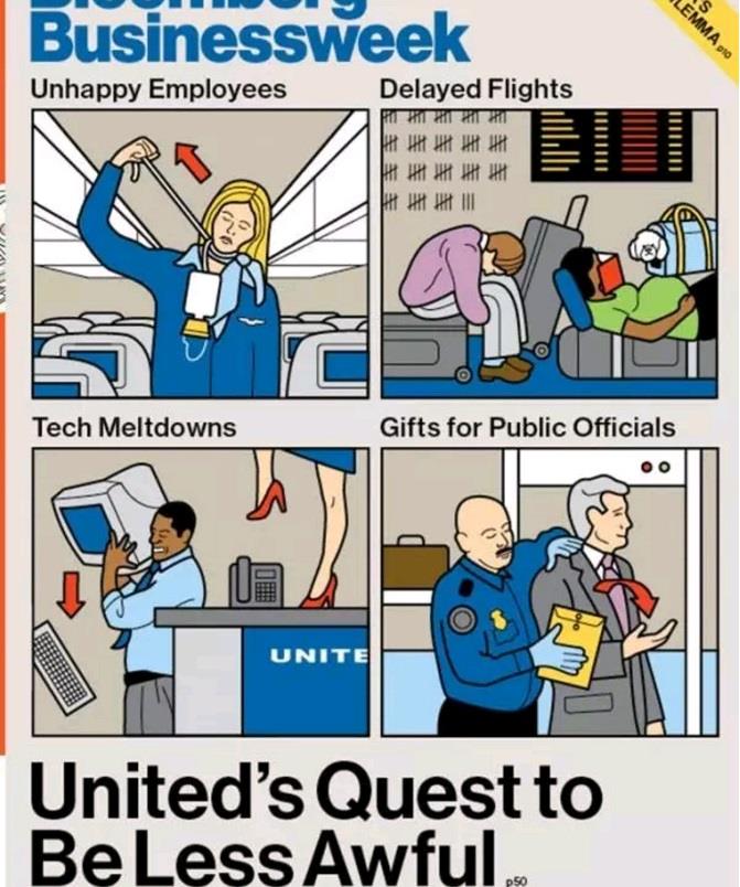 美国《彭博商业周刊》1月18日封面 03. 被惯坏的雇员 那么,美联航为什么会成为这样一家服务恶劣、屡屡上榜又屡教不改的最渣航空公司呢? 1994年,联合航空公司的雇员购买了公司55%的股份,交换条件是对工资和福利等做出让步,这使得联合航空公司成为世界上最大的大多数股份由雇员拥有的航空公司。 也就是说,这是一家员工持股的航空公司,员工作为股东,所拥有的话语权,也就大了很多,但是很显然,这些美联航的雇员们,并没有利用他们的话语权来提升服务,而是在为他们自己,寻求舒适和偷懒来做辩护。 比如这一次的华裔医生被拖下飞机事件,起因就是美联航的雇员要乘坐飞机,所以才选择4名乘客下飞机,这就是典型的“雇员高于乘客”,或许他们觉得,自己是公司持股人,有这个权利。 此外,美联航的员工与管理层之间,也是矛盾重重。 据美国《彭博商业周刊》2016年初报道,美联航的许多雇员抱怨说,管理层一心削减成本:裁员、休假、行李处理和地勤人员的工作,都外包给了其他企业。雇员说,公司甚至不赞成他们向有不满情绪的滞留乘客发放代金券。就连航空公司的制服都沦为削减成本的牺牲品。 所谓的代金券,就是发给被赶下飞机旅客的“400美金”,那并不是现金,而是一年有效期的购买美联航机票的等额代金券。也就是说,美联航的管理层,一方面想最多地超售来赚钱,另一方面,因为他们超售被赶下飞机的旅客,他们却连一张代金券补偿都不想给。 这家航空公司简直把旅客当成他们的赚钱工具,像牛马一样的,想赶上来就赶上来,想赶下去就赶下去。所以在一篇名为《我为什么再也不飞美联航了》的网文中,作者列举了美联航几大罪状: