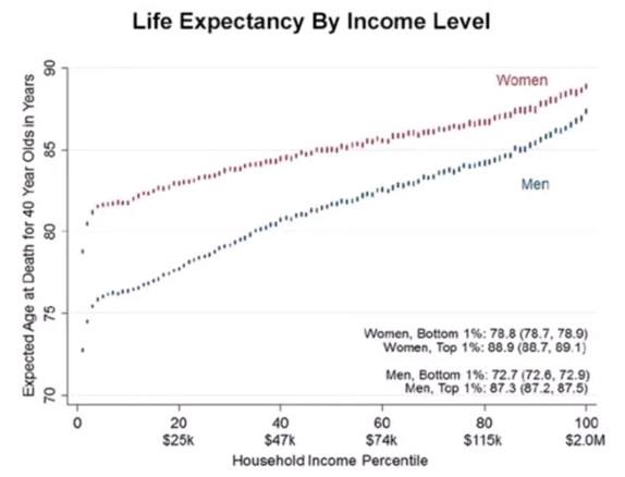 我们的一个朋友,父母住福利房,多年公费医疗看病。却是激进的川普支持者 。(不知道的人需要知道川普是共和党,共和党的两大诉求就是减少给穷人的福利,减少政府开支,然后是给富人减税。) 说这些的意思是,没有意识到你在吃福利不代表没有享受福利,只是你没意识到而已。福利有很多种,不仅仅是大家明显看到的那些,比如住福利房,拿食物劵, 领救济。任何因为政府的特殊政策或给你个人或一群人单独花钱的都是福利, 因为那是其他不归此类的人享受不到的。从另一个角度说就是任何不是针对全民的减少政府税收的政策或机构,都是一种福利。 我下面来列举一些我知道的例子,不认同的话,想一想这些在中国是不是叫福利。 1. 失业救济金。这是一个政府办的失业保险。一般都是企业付钱在一个基金里,经济好的时候,大概可以自负盈亏,像上次2007年经济危机,很多人失业很长时间,钱就不够用了,最后还得联邦拨款;再退一步说,即使没有亏钱,这也是一个政府的项目。你用了,就是享受了一种福利; 2. 医疗保险。 我们大部分人都是在公司里工作,通过公司来买保险,公司和个人用来买保险的保费支出是税前的。如果没有政府福利的话,恐怕没有几个公司会给职员提供保险, 这种优惠是其他没有买保险的人无法享受到的,也是福利; 3. Mortgage(房贷)利息是可以抵税的。对有钱买大房子的人来说,利息抵税是很大的优惠,是租房的人不能享受的,是一种福利; 4. 公立小学、中学是义务教育,公立大学是有大量政府补贴的。小学中学的费用来自于地方税收(房地产税),基本是没孩子的家长在帮助有孩子的家长在付学费。大学更是这样。 5. 对上私立学校的人来说,家长们往往以为学费完全是自己掏的钱,其实,大学,尤其是最好的私立大学,享受的政府优惠更多,学校在每个学生身上的投入远远你所支付的全额学费。私立学校大都是非营利(not-for-profit)机构。有很多人给学校捐款。这些捐款是可以抵税的。另一方面,私立学校的地产税是免收的。学校endowment里赚来的钱也是免税的。另一个政府资金来源就是公众项目,更别提学生贷款,大多是联邦出资的。也就是说,你孩子很优秀,上了名牌私立大学,你交了大笔钱,但实际上,你还是享受了很多政府福利; 6. 学医在美国是耗时最长,花钱最多,也是今后差不多挣钱最多的一个专业。每个医生学出来都认为是凭着自己的努力和投资得来的,挣钱多也是应该的,和政府没一毛钱的关系。其实不然。且不说前面两项所说的政府对大学支持的福利,政府对学医的学生的支持比其他行业更多,只是没有几个人知道而已。众所周知,医生最后都要通过最苦最累的住院医一步,找到了住院医位置基本上以后就没有问题了。美国医院全是私立的,怎么和政府有关系呢?其实,住院医过程中所有的费用都是 Medicare 出资的,包括他们的工资。Medicare 就是国家给老人的医疗保险,我们每个人一辈子都在往里面放钱的,这是政府给学医的学生最直接的福利。其实可以这么说,每个医生的 “完成”,都有全体人民的投资; 7. 我们外国人,尤其是早期的第一代移民,刚到美国的时候大多是靠在学校做工赚钱。最普遍的是帮教授做研究的,那大都是政府直接提供的项目;当然,也还有很多打过黑工的,也就是现在要打击的非法移民(不知道在高喊 law and order 的人群中有多少这样的人,相信是有的)。这些人可能自己觉得在被老板剥削,没有意识到自己很可能在享受一种福利! 那时有送孩子上学的,就更是享受福利啦! 8. 我们周围有很多在医药行业工作的人。美国对药是有很强的保护的。一个药在FDA批准后,有15年的专利保护。这也是一种福利,在医药行业工作的朋友就是政府福利直接受惠者。 最后说的这两个不能算作政府来的福利,但也是有人做了贡献才来的,只是来源可能是你想不到的。 美国是只要是你工作,雇主就会自动从工资里扣除养老退休(social security)和医疗保险(medicare)。 这两项最后的享用是根据年龄来的。医保是65岁,法定退休年龄根据年龄不等,我这样岁数的62.5 岁退休的话可以拿一部分,67岁退休可以拿到全部。 拿钱的多少是政府根据精算师的计算看你能活多久来决定的。 我的年龄政府认为我可以活到85岁。如果我活多了,就会多拿,反之就会少拿。 共和党人总是说要延迟退休年龄,因为现在大家都活得长了,大家都深以为然。其实却不然。下面这个图是期望年龄和收入的相关图: