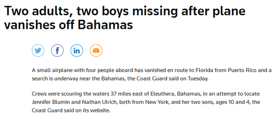 百慕大三角”指百慕大群岛、美国佛罗里达州和波多黎各之间的大西洋海域三角地带,这片海域常发生一些神秘的、不可理解的各种失踪事件。据英国路透社5月16日消息,美国海岸警卫队当天称,一架载有4名乘客的小型飞机在由波多黎各飞往佛罗里达州的途中失踪,警卫队已开始在巴哈马群岛附近进行搜寻。 美国海岸警卫队网站发布消息称,这架飞机当地时间15日上午11时许从波多黎各起飞,迈阿密空中交通管制部门当日14时10分宣布与MU-2B失联,当时该飞机正以300海里/小时(约556公里/小时)的速度在距离海平面2.4万英尺(约7000多米)的高空中行进。 报道指出,失联飞机载有2名成年人以及2名分别为4岁和10岁的男孩。在皇家巴哈马国防军以及美国海关及边境保卫局的协助下,美国海岸警卫队已开始在巴哈马群岛附近进行搜寻。