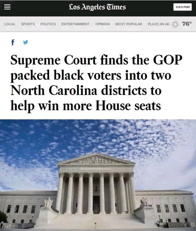 今天美国最高法院判决北卡州(North Carolina)众议院在2010年人口普查后的两个选区重划违宪。 这次被告的分别为北卡东北角的第一选区和南部及中部的第十二选区。新的选区划分方式把第一选区的黑人选民从原先的48.6%提高到了现在的52.7%,第十二选区则是从43.8%到50.7%。最高法院的判决是两个选区的重新划分均违宪,第一选区的判决是所有大法官都一致同意的,第十二选区则是以大法官Samuel A. Alito Jr.,John G. Roberts Jr.和Anthony M. Kennedy为少数派的5:3判决。因为庭辩是在新加入的大法官Neil M. Gorsuch参加最高法院之前进行的,Gorsuch没有参加判决投票。 根据以往最高法院的判决,美国法律是允许党派为了政治上的优势划分选区的,但不允许以种族为理由这样做。大法官Elena Kagan在判决书中指出,在重划选区之前,该选区的黑人选民已经能够选出自己中意的候选人,在此基础上再增加黑人选民就是为了把黑人的选票过分集中,浪费大量黑人选票,使其不能比较均衡、平衡地起适当的法律作用,所以属于不公正地划分选区。大法官Alito的少数派意见认为这类划分选区行为自建国之时就有了,这个判决是不尊重法庭先例的表现,而且原告方没有给出自己的选区划分方案。大法官Kagan写判决书时连带反驳了少数派的意见,指出控告现行选区划分违宪并不需要提供自己的划分方案。并诙谐地说少数派的分析是如此的偏颇、空洞,就仿佛演出莎士比亚的《哈姆雷特》却没有王子这个角色。