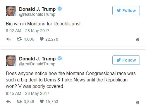 川普的出国访问有四大亮点。第一是和世界最大的武器进口国沙特阿拉伯签订了3500亿美元的武器出售合同。第二是和法国总统马克龙握手较劲。第三是批评北约要求其他成员国出更多钱。第四是拒绝在七国会议上签字巴黎气候协定,把德国总理激怒并带来更多外交后果。 然后他提到蒙大拿州共和党候选人在国会议员特别选举的胜利。他认为在共和党候选人取胜以后,媒体就不给予应有的报道。 “你们注意到在共和党候选人得胜之前,蒙大拿州的国会议员选举本来对民主党和假新闻媒体多么重要吗?”川普在推特上说,“胜利了就不报道了。”