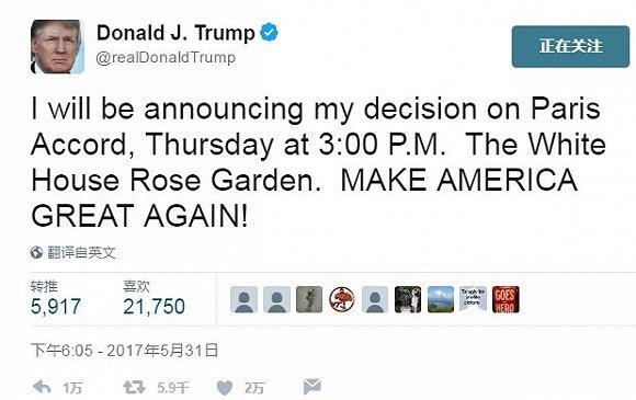 在多家美国媒体指出特朗普决定带美国退出巴黎气候协定之后,欧洲媒体报道称欧盟将与中国结成联盟,在周五发表联合声明,携手推动执行巴黎气候协定。 包括卫报、《金融时报》和BBC在内的多家欧洲媒体5月31日报道,这份联合声明将于周五在布鲁塞尔的欧盟中国峰会后发表。今年的欧盟中国峰会将于当地时间6月1日举行,为期两天。 据各大媒体获得的联合声明草案显示,中国和欧盟达成协议,将携手推动巴黎气候协定的“历史成果”,加速“全球向清洁能源的转换”。 草案称气候变化是一个“国家安全问题”,各国向清洁能源的转换能增加就业、促进经济增长,“欧洲和中国都认为巴黎协定是一项历史性成果”,“不可逆转”。 媒体获得的草案内容显示,中国和欧盟承诺将增强措施、加强各自在减少碳排放上的国家政策,同时展开清洁能源方面的合作。双方合作的领域包括排污权交易系统、能效标识、低碳交通、城市之间的低碳合作等。 除此之外,作为全球最大的碳交易市场,欧盟同意将向中国提供1000万欧元的资金,帮助中国在今年推出自己的全国性碳排放交易系统。 双方还同意为全球最贫困的国家提供帮助,协助这些国家发展绿色经济。 欧盟的气候变化和能源委员卡内特(Miguel Arias Cañete)表示,在向清洁能源转换的路上,“没有人该被留下,但欧盟和中国决定向前走”。 周三,多家美国媒体报道称,美国总统特朗普已经决定要让美国退出巴黎气候协定,并将在近几天正式对外公布。 当天,特朗普在Twitter上发文宣布将在当地时间周四下午3点(北京时间周五凌晨3点)公布关于巴黎气候协定的决定。