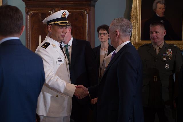 美国防长马蒂斯(左一)、美国参谋长联席会议主席约瑟夫·邓福德和中国驻美大使崔天凯。
