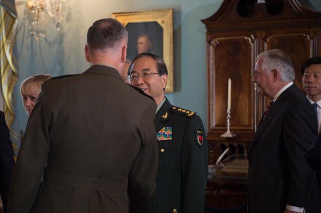 美国国务卿蒂勒森和中国中央军委联合参谋部参谋长房峰辉、中国国务委员杨洁篪。