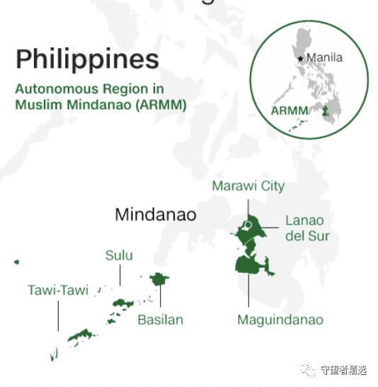 恐怕伊斯兰虔诚与圣战之间的关系最生动的例子出现在菲律宾的“棉兰老穆斯林自治区(ARMM)”, 自从5月份宣称效忠伊斯兰国的暴恐分子发动了大规模圣战以来,该地区持续不断的冲突已经造成了近500人死亡,大批平民流离失所,当地城市马拉维遭暴恐武装控制。 绿色部分为菲律宾的棉兰老穆斯林自治区