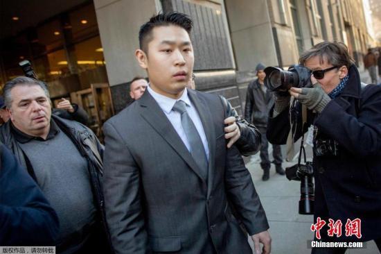资料图:当地时间2015年2月11日,美国纽约,2014年11月枪杀一名手无寸铁非裔青年的华裔警察梁彼得(Peter Liang)被起诉后被法院传讯。2014年11月20日的深夜,28岁的非裔青年雅佳·格雷(Akai Gurley)和女友在布鲁克林一间公寓漆黑的楼梯间与华裔警察梁彼得遭遇,最终手无寸铁的格雷被梁彼得枪杀。