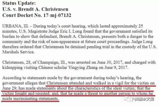 5日的伊利诺伊州香槟市气温高达近80华氏度,章莹颖被绑架案的嫌犯克里斯滕森第二次聆讯今天开庭,此次聆讯唯一的目的,是决定嫌犯是否可以保释。 而法官的答案是:不能保释!5日检方陈述了大量嫌犯犯罪细节曝光,令人不寒而栗。