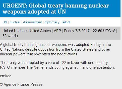 【快讯!联合国通过全球禁止核武器公约】据法新社7月7日消息,联合国以122票赞成、1票反对、1票弃权通过了在全球范围内禁止核武器的公约。这是历史上第一次通过此类型的公约。