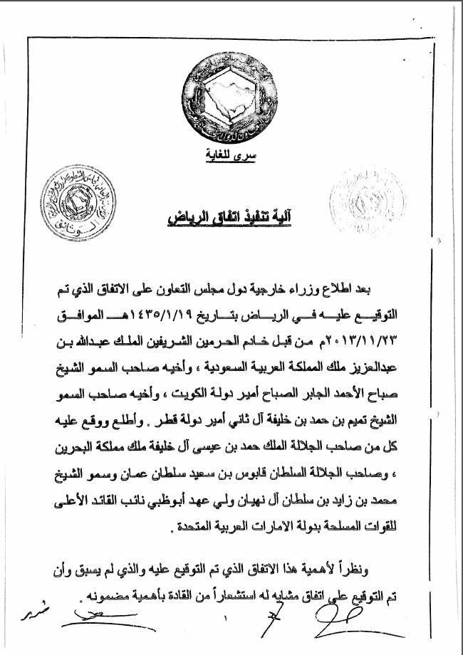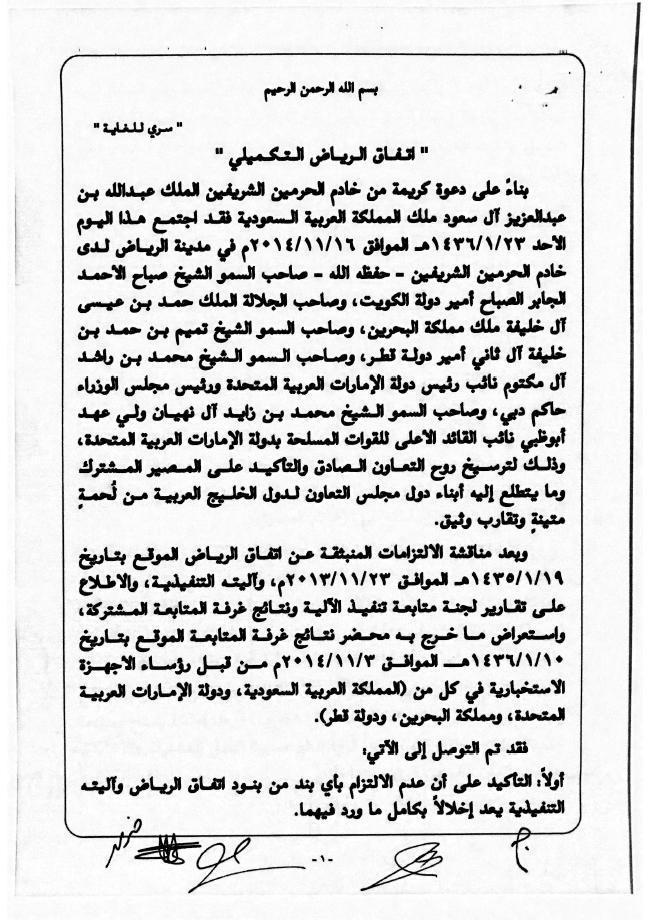 当地时间10日晚,沙特多家媒体曝光了两份标记为“绝密”的文件,分别为沙特等国与卡塔尔在2013年11月签订的《利雅得协议》,以及2014年11月签订的《利雅得补充协议》。