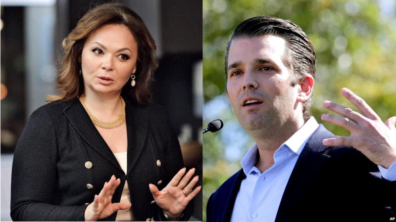这幅合成照片中右边是川普长子小川普,左边是俄罗斯政府律师纳塔莉亚·维塞尔尼茨卡娅。 华盛顿 — 刚刚透露出来的电邮显示,俄罗斯一名律师的代理去年承诺美国总统川普的长子会提供有关川普的竞争对手、民主党总统候选人希拉里·克林顿的负面信息,以加大莫斯科对川普竞选的支持力度。 川普的长子小唐纳德·川普星期二公布了许多他与美国音乐推广者(游说人员)罗布·戈德斯通之间的电邮。戈德斯通是俄罗斯律师纳塔莉亚·维塞尔尼茨卡娅的代表。维塞尔尼茨卡娅是在去年六月中旬与小川普会面的。当时,川普刚刚获得共和党总统提名。 这些电邮出现的时候正值国会两院和司法部特别检查官罗伯特·穆勒领导的对俄罗斯染指美国大选问题展开多项刑事调查齐头并进的时候。穆勒曾经担任美国联邦调查局局长。美国情报界已经得出结论,认定俄罗斯总统普京亲自指挥了旨在摧毁克林顿声誉,帮助川普击败克林顿当选总统的活动。 6月3日,戈德斯通通过电邮告诉小川普:“俄罗斯终身检察官……愿意给川普竞选班子提供一些可以至罪克林顿和有关她与俄罗斯之间交易记录的官方文件和信息,这些东西会对你的父亲非常有用。” 这封电邮说,“这些信息显然属于非常高级别的敏感信息,这是俄罗斯及其政府给川普先生提供支持的一部分。” 过了几分钟,小川普回答说,“如果这就是你说的,我非常喜欢,尤其是在今年夏季末期(使用)。 过了几天,戈德斯通说,维塞尔尼茨卡娅是“俄罗斯政府律师,她将从莫斯科飞过来”与小川普见面。莫斯科否认知道维塞尔尼茨卡娅这个人,并拒绝了美国关于俄罗斯干涉美国选举的说法。 纽约时报说,它曾告知小川普,该报将在近期刊登的有关维塞尔尼茨卡娅与小川普会面的报道中披露有关电邮。小川普在此之后公布了这些电邮。 小川普公布电邮之后几个小时,川普总统发表声明说,“我儿子是一个高素质的人,我为他的透明度鼓掌。” 白宫女发言人萨拉·哈卡比·桑德斯避开了记者就这些电邮提出的其它问题,让记者去问小川普的律师。 小川普在公布这些电邮的时候说,在他去年与维塞尔尼茨卡娅见面期间,在他看来,很明显,这名俄罗斯律师并没有任何关于克林顿的负面资料可以给他。小川普说,这个律师立刻把话题转到美国准备制裁俄罗斯的有关措施的问题上和莫斯科下令停止让美国人领养俄罗斯儿童的事情上。 星期一,在小川普公布这些电邮前,白宫为小川普与维塞尔尼茨卡娅的会面辩护说,会面没有包含任何东西,这恰恰证明了川普竞选团队与俄罗斯之间没有任何旨在帮助川普团队的勾结。 参加小川普与维赛尔尼茨卡雅会见的有时任川普竞选团队经理的保罗·马纳福特和川普女婿贾里德·库什纳。他们两人现在都是白宫的总统顾问。库什纳的妻子是川普的女儿伊万卡。