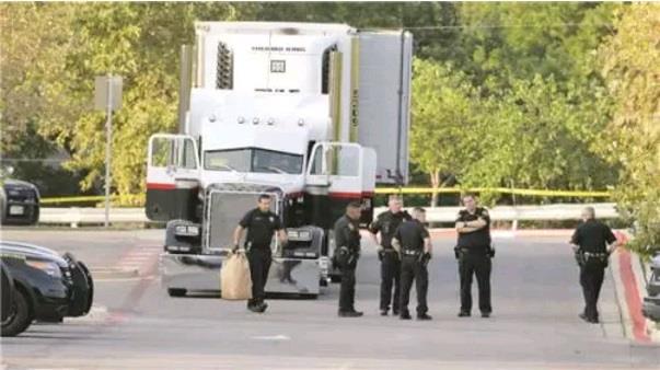 7月23日,得州圣安东尼奥警方在这辆拖挂式大货车上发现了38个偷渡客。 据美联社报道,因为天气过热,一辆运送偷渡客的大货车在得克萨斯州发生惨剧,警察发现躲在其中的38名非法移民有8人已经死亡,另外一人在送往医院后死亡。警方称,他们都是死于脱水和高温,其他人健康状况堪忧。 据圣安东尼奥市警察局长麦克马努斯(William McManus)介绍,那辆重型货车停在当地一家沃尔玛商店的停车场内,车内一个男子向沃尔玛员工要水喝。该男子告诉沃尔玛员工,货车里还有更多人需要帮助。那个员工把水给了该男子后,立刻打电话报了警。警察赶到后,发现大货车封闭的车厢里藏了38个人,其中有两个学龄儿童。
