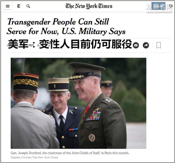 在美国总统特朗普发推禁止跨性别者在美军服役的隔天,美军方最高级别官员邓福德(Joe Dunford)7月27日明确表示,目前允许跨性别者服役的政策不会改变。这被一些媒体报道为“打脸”。