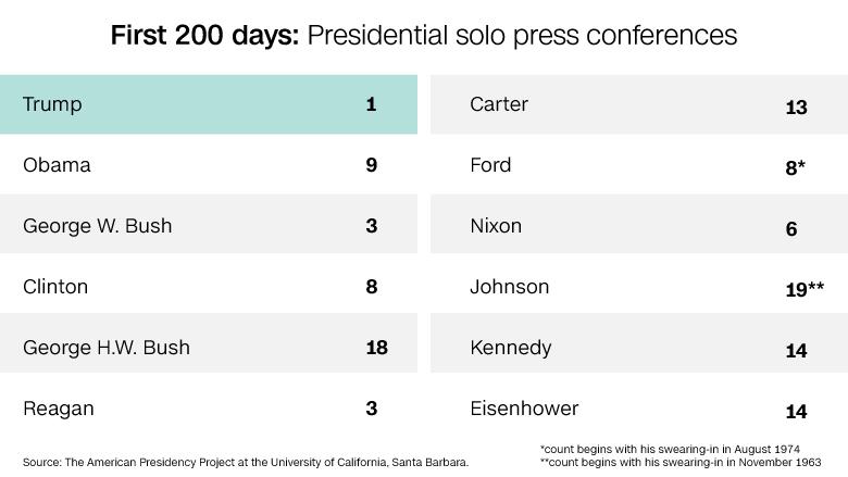 图为总统川普在2月16日的记者会上讲话。那是他就任总统之后200天内单独举行的唯一一次记者会。(美联社图) 总统川普上台200天,单独举行的记者会只有一次,为64年来最低纪录。 据有线电视新闻网(CNN)报道,自从艾森豪威尔总统以来,历届总统在上任前200天单独举行的记者会次数都超过川普。 有些总统要超过川普许多倍:约翰逊和老布什在他们的总统任期前200天分别举行过19次和18次记者会。 川普唯一的单独记者会是在2月16日举行,当时在他宣誓就职后还不到一个月。 CNN根据加州大学圣巴巴拉分校美国总统项目的数据列出现代总统在前200天单独举行的记者会次数如下: