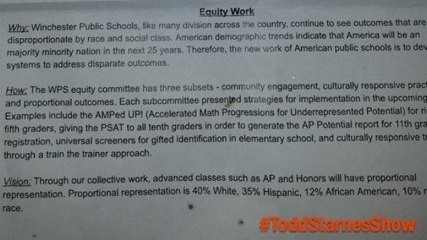 Martin Luther King, Jr. must be turning over in his grave. Click here for a free subscription to Todd’s newsletter: a must-read for Conservatives! A parent forwarded me a copy of the letter sent from John Handley High School in Winchester. “Through our collective work, advanced classes such as AP and Honors will have proportional representation,” read the letter. “Proportional representation is 40% White, 35% Hispanic, 12% African American, 10% mixed race.” The letter went on to explain that public schools across the country “continue to see outcomes that are disproportionate by race and social class.”