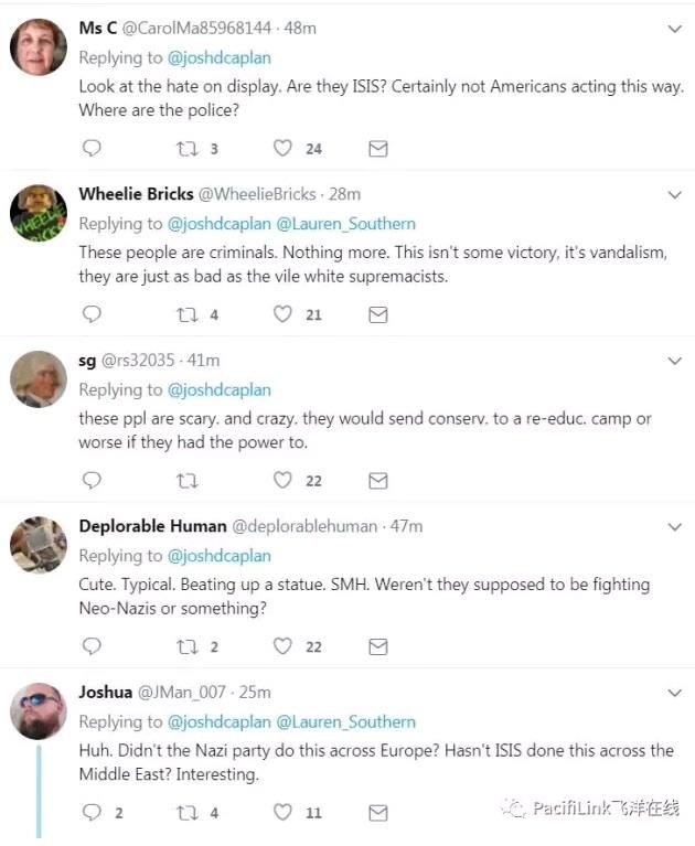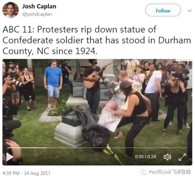 这座雕像位于北卡州Durham County,1924年竖立,在美国已经堪称文物了。雕像是纪念南北战争期间南方邦联士兵(Confederate),而任何与邦联有关的名人或古迹近几年都是左派的眼中钉。周末在维吉尼亚爆发的种族骚乱,也是因为南方统帅李将军的雕像被移除,极右白人去抗议,极左组织去闹场,最终酿成惨剧。 蓄奴已经成为历史,哪怕再黑暗,也无法被抹去。而这些古迹100年来并没有什么争议。但是现在左派掀起一阵阵运动,比如禁止邦联旗帜,拆除雕像,撤换纸币上总统的肖像,甚至要求大学改名,不一而足。大概是眼不见心不烦? 但是这些运动也遭到当地民众反感,有人认为历史应该保留,起码还有教育意义。有人认为邦联遗迹并不意味着支持蓄奴,左派这么做毫无道理。当然还有人觉得他们就是吃饱了撑的,刷存在感。 无论怎样,争执还会继续,冲突依然会爆发。 这种毁坏公物的行为当然是违法的,但是到现在为止没听说任何人被捕,也没有看到政客出来谴责违法行径。网民除了调侃,还真没什么办法: Ms. C:"看看这些仇恨。他们是ISIS吗?这种行为肯定不像美国人,警察去哪里了?" Wheelie Bricks:"这些人就是罪犯。这不是什么胜利,就是破坏,他们和那些恶劣的白人至上份子没什么区别。" sg "这些人很可怕,很疯狂。他们会把保守派送到劳教营,如果他们有这个权力的话。" Deplorable Human:"多可爱!典型作为,暴打一个雕像。他们不是应该和新纳粹对打吗?" Jushua:"对了,纳粹过去不是在欧洲一直这么干吗?ISIS在中东也干这事儿,对吧?有意思。"
