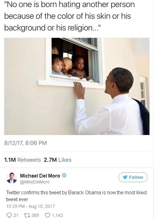 美国前总统奥巴马在米兰召开的全球食品创新峰会上讲话 (2017年5月9日) 美国维吉尼亚州夏洛茨维尔市上周末发生致命的暴力冲突后,美国前总统奥巴马星期六在推特上发的一张照片如今已成为推特有史以来点赞最多的一条推文。 照片上的奥巴马一只手扶在窗台上,西装上衣随意地搭在肩头,仰头看向开着的窗户里不同种族的小孩子。 奥巴马在照片下引述前南非总统曼德拉的话写道:“没有人生来就因为肤色、背景或是宗教信仰而憎恨别人。