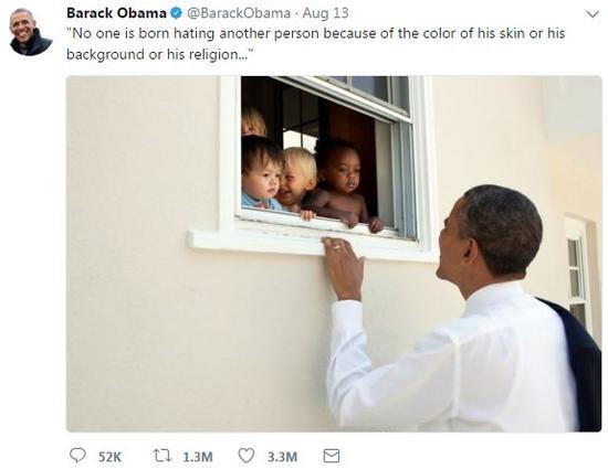 近日,美国社交媒体“推特”上单条推文的点赞数字记录再次被打破,而打破这一记录的正是刚卸任不满一年的美国前总统奥巴马。 据美国《纽约时报》报道,8月13日,奥巴马就美国此前发生的白人种族主义暴力事件发表推文,引述反对种族隔离的前南非总统曼德拉的名言:“没有人生来就仇恨他人,无论是因为对方的肤色、背景,还是所信仰的宗教。人们的仇恨是学来的。如果人们可以学习仇恨,那么,他们也可以被教导去爱,因为爱更自然反映人心。"奥巴马还在推文中附上了一张自己的照片,照片中的奥巴马一只手扶在窗台上,西装上衣随意地搭在肩头,仰头看向开着的窗户里不同种族的小孩子。