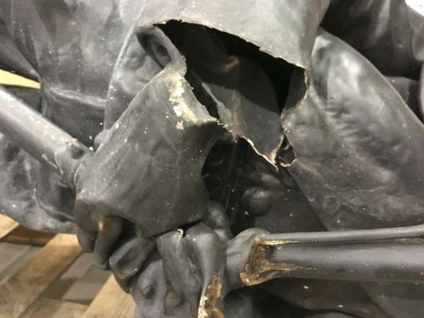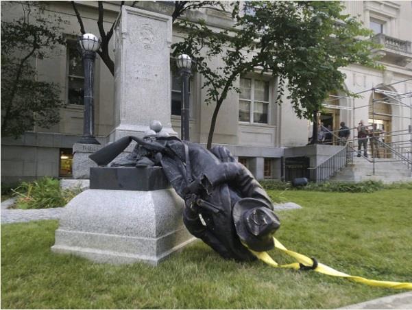 邦联士兵凋像被推倒砸破,露出青铜底色。(美联社)