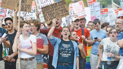 8月19日,美国波士顿发生大规模反种族主义示威游行。图为示威者高举反对种族主义的标语。
