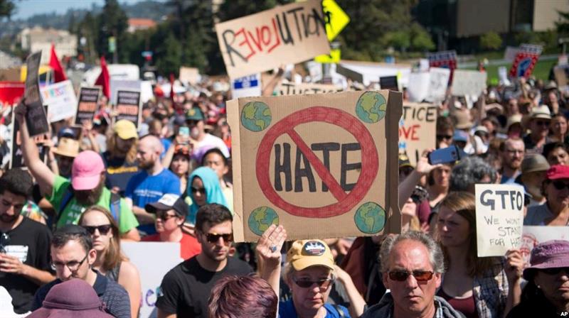 在美国加利福尼亚州伯克利市,人们游行,反对仇恨 (2017年8月27日) 在美国加利福尼亚州伯克利市,尽管一场极右翼集会的计划已经取消, 但反对这场集会的人们仍然纷纷走上街头示威。 星期天是旧金山湾区示威的第二天。星期六,众多示威者者反对名为爱国者抗议集会的另一个右翼聚会,那场聚会也被取消。旧金山市长埃德·李宣布战胜了一个他所说的鼓动仇恨的团体。 星期日,在旧金山湾,在同大都会旧金山隔水相望的伯克利,警方在原定举行集会的公园附近设置了路障。当局还搭建了金属路障,有警察守候。 携带防暴装备的警察站在公园入口处,在对面的街道上,有几十人。人们可以进入公园,但先要检查包裹,看看有没有违禁品,包括滑板和棒球棍。那些带着狗的人,或用围巾或披肩遮住脸部的人,也被禁止入内。 曾有几十名左翼示威者围住了一小群右翼示威者,对他们喊叫和推挤,出现了紧张而又短暂的小冲突。警察护送被围困者离开了公园。 另一场反右翼示威发生在加利福尼亚大学伯克利分校校园。当天晚些时候,这批人离开了校园,游行到公园,参加那里的集会。 警方采取预防措施,是为了防止以前在伯克利示威中出现的暴力。在二月份,“布莱巴特新闻网”(Breitbart)前任编辑扬诺普洛斯(Milo Yiannopoulos)在加州大学伯克利分校的演讲计划,引发暴力骚乱,给大学校园和周边企业造成几十万美元的损失。 扬诺普洛斯的演讲随后取消了。但他已经表示,应一家倾向保守派的校园报纸的邀请,他将在9月底前往伯克利。 为了应对二月份的暴力抗议,唐纳德·川普总统威胁说,如果这所大学的政策是允许抗议者不让那些持不同意见者发言,就撤销联邦对其的资助。作为回应,加州副州长加文·纽科姆(Gavin Newsom)表示,扬诺普洛斯拥有不可接受的白人至上主义观点,而在国家公立大学,“没有仇恨的容身之地”。