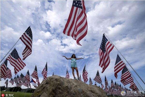 当地时间2017年9月10日,美国洛杉矶,佩珀代因大学升起3000面国旗,纪念911遇难者。来源:东方IC