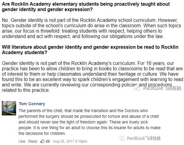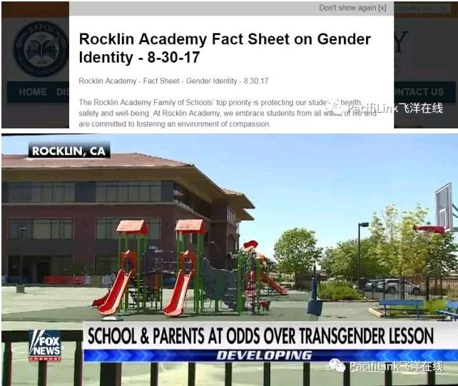 小孩子回家之后很害怕,跟妈妈说在学校闯祸了。妈妈赶紧和学校联系问是怎么回事,才知道发生了这么一出。她给校长写信说她完全支持保护这个变性孩子的权益,可是她自己的孩子也要受到保护吧? Alliance Defending Freedom,一个全国知名的宗教自由律师事务所,正在调查这起事件。 其实在放假前,这个学校已经陷入一场争议: 在家长未知的情况下,学校给5岁的孩子教有关变性人的书。对这些学前班的孩子说,男孩可以变成女孩,女孩可以变成男孩。然后,正式宣布,这个男孩...现在就是女孩子啦! 然后就有效果了。一个女孩子在家洗澡,看到自己湿湿的头发贴着后脑勺,突然害怕地发抖,开始和妈妈哭泣:”我要变成男孩了,我不想变成男孩。“ 显然学校的教育把孩子搞糊涂,并且吓着了。 家长们暴怒,说你们要是早说,我们孩子这节课就不去了。但是学校跟家长说你们不来也不行,而且加州不要求学校事先通知你们。 "Parents were furious because they were not informed in advance and were not given the chance to opt their five-year-olds from the classroom transgender activity. However, school leaders informed moms and dads – they were not allowed to opt-out – and the state did not require them to notify parents." 学校网站的首页,一进去就弹出一篇关于变性人的声明,看来学校的行为已经引起各方关注了: