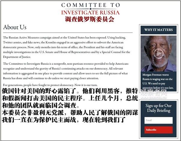 (弗里曼反俄视频,图源:CIR视频) 之后,弗里曼用磁性的声音讲了一个惊人的故事。故事大致的逻辑如下: 1、前克格勃间谍普京因为苏联垮台怀恨于心,在后苏联政权中步步高升成为总统,并决心复仇。 2、普京当上总统后无所不用其极打击世界各民主国家政体,摧毁民主媒体的公信力。 3、总统(特朗普)应该调查俄罗斯,保护美国。 4、美国人民要雄起,要保卫民主! 弗里曼为什么要录这么个视频呢?经过观察者网调查,原来这是一个新成立的组织想要讨一个开门红。 看到视频左上方的CIR了么,CIR全称The Committee to Investigate Russia,翻译成中文就是调查俄罗斯委员会。 我们查看了一下该组织的官网,发现这不是一个政府组织。 该组织宣称自己是一个非盈利无党派机构,目的是为了让美国人民警醒,知道俄罗斯的威胁。