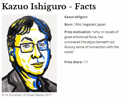 瑞典当地时间13时,瑞典文学院宣布2017年诺贝尔文学奖授予日裔英国籍作家石黑一雄。颁奖词说:“他的小说富有激情的力量,在我们与世界连为一体的幻觉下,他展现了一道深渊。”