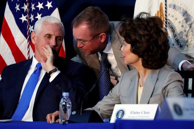 副总统潘斯(左)召集美国太空委员会,与白宫管理及预算局局长穆瓦尼(中)交谈,右为运输部长赵小兰。(路透) 「华邮」报导指出,赵小兰今年6月原本计画搭民航客机前往底特律宣导联邦运输部公路新政,出发前数日,接到白宫要求赵更改底特律出访行程,以配合总统「基础建设周」出席站台,赵小兰为了行程两不误,由民航局代租用赛斯纳商业喷射机(Cessna business jet),也因有私人专机服务,赵小兰在出席底特律活动后,两天内又以商业机票费用赶回华府参加国会对民航机费用的讨论。