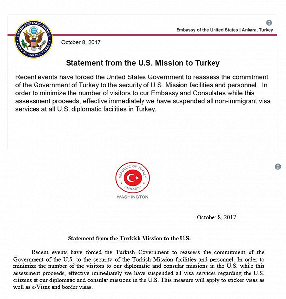 2017年5月16日,美国总统特朗普在白宫和到访的土耳其总统埃尔多安举行会晤,双方称两国之间的北约盟友关系十分坚固。 当地时间10月8日,美国驻土耳其使馆在其官方网站发布声明称,鉴于最近发生的一些事件,美国驻土耳其使领馆将重新评估土耳其政府对于保护美国使领馆设施和人员安全的承诺。为了在评估期间尽可能减少访客数量,美国驻土耳其使馆将立即暂停所有非移民签证服务。 而就在几个小时之后,土耳其驻美使馆也发布了类似声明以示报复,宣布将暂停向美国公民发放签证,但未说明已持有土耳其签证的美国公民是否可以进入土耳其等相关问题。