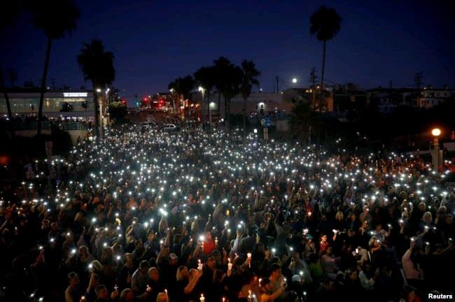 美国加州曼哈顿海滩市的人们悼念在拉斯维加斯城 “91号公路丰收节” 美国乡村音乐会上遭到枪击的遇难者、该市居民拉希尔·帕克和桑迪·凯西(2017年10月4日)。
