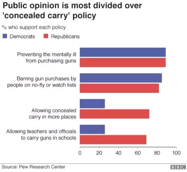 4. 在枪支管理上,共和党和民主党最大的分歧在是否允许更多地方可以随身带枪。
