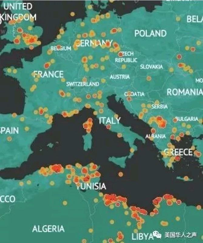 图中的红点代表一次恐怖袭击,波兰境内的恐怖袭击显示为0