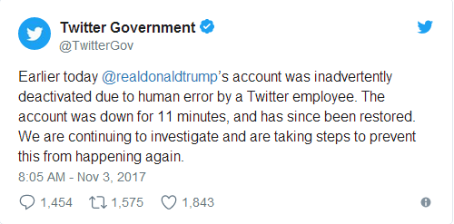 据美国有线电视新闻网(CNN)报道,在“页面不存在”数分钟后,特朗普的推特账户恢复了正常。对此,美国网友调侃称,“那一刻, 页面不存在 才是真正的总统。” 对此,推特作出回应表示,“今日稍早,特朗普推特账户被不小心停用,原因是推特一名工作人员的人为失误。账户下线共持续11分钟,并已被恢复。我们将继续进行调查,并采取措施防止此类事件再次发生。”