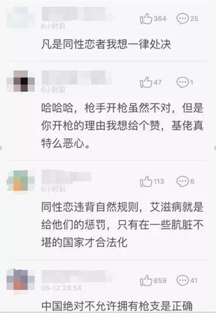 在中国,恐同一样很严重。几年前,公众人物吕丽萍、孙海英夫妇公开发表恐同的言论受到批评。如果我们打开网上同性恋相关的新闻报道,后面的评论区就可见恐同的广泛性。美国同性恋夜店被枪击事件发生后,国内某网站8000多条评论中,相当一部分是恐同仇恨言论。写下这些言论的人,甚至都没有意识到他们的言论,让另外一些人看到,会有怎样的感受。