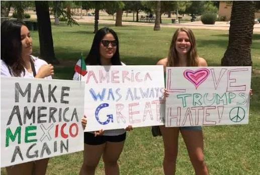图片从左到右写着:让美国变回墨西哥,美国曾经很伟大,爱恨川普的人