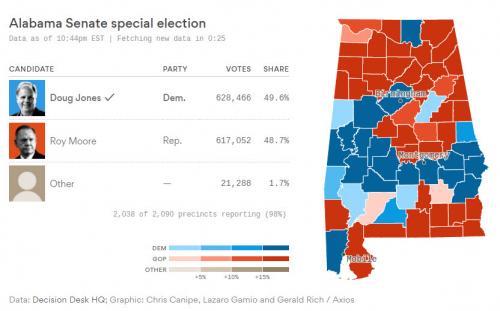 2018年美国国会中期选举狼烟未起,共和党和民主党已然分别开始布子造势,被视为中期选举前最重要的一场前哨战:阿拉巴马州联邦参议员补选于本月12日拉开帷幕,吸引了国内外广泛关注。 川普和班农亲自背书的摩尔(Roy Moore)出马,与民主党的琼斯(Doug Jones)一决胜负,争夺国会参议院的1个宝贵席位。 此役被视为测试川普支持度的重要指标,但胜负却充满变数。 结果出人意料。 虽然阿拉巴马属于美国传统的“深红州”,向来被共和党视为囊中之物,去年川普在此州更是以27个百分点大胜民主党的希拉里。然后由于性丑闻缠身,共和党候选人摩尔还是以1.5个百分点的微弱劣势惜败于民主党候选人。这也是该州20多年来第一次选出民主党参议员。
