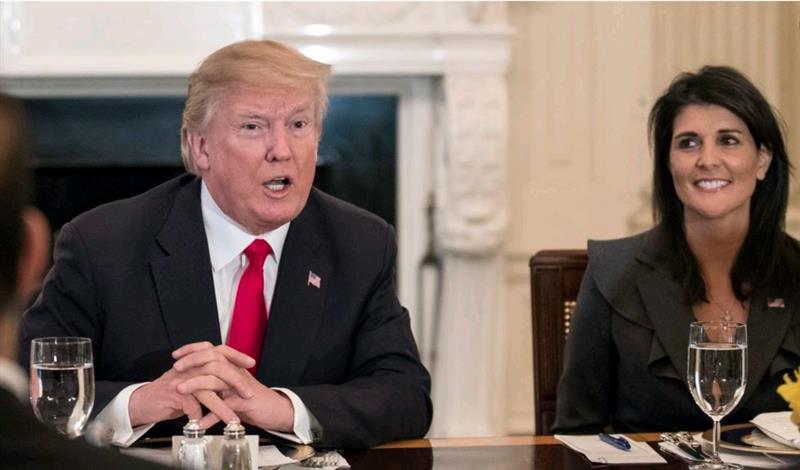 美国总统川普在白宫国宴厅与到访的联合国安理会成员国的代表共进工作午餐。 美国常驻联合国大使妮基·黑利在场(2018年1月29日)