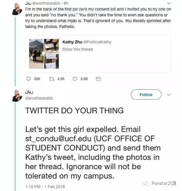 最近佛罗里达中央大学(UCF)的一位华裔女学生就遇到了这样的麻烦,甚至被多名穆斯林学生逼迫开除,闹得沸沸扬扬,不过事态最终得到了控住。 事情究竟是怎样的呢? 上周四2月1日,在佛罗里达中央大学(UCF)校园,19岁的华裔女生Kathy朱走在校园,在经过学校穆斯林学生会“体验穆斯林传统服饰头巾”的活动摊位时,被其中一位叫苏卡利(Rayyan Sukkarieh)的穆斯林女孩建议试戴穆斯林包头围巾。 随后,Kathy朱礼貌谢绝,并随手拍了三张照片(校园公开场合)发在推特帐户。 本来是很正常的内容,不知道怎么,却被被苏卡利(Rayyan Sukkarieh)转发,还称Kathy没经过她同意发图。 苏卡利认为Kathy朱没了解穆斯林头饰(Hijab)是什么就拒绝试戴(no thank you),无知又没礼貌,并且言语激烈,抨击Kathy朱,称“我们校园绝不允许有这样的人。“ “请大家给学校学生办公室写信,要求校方开除该中国学生”。