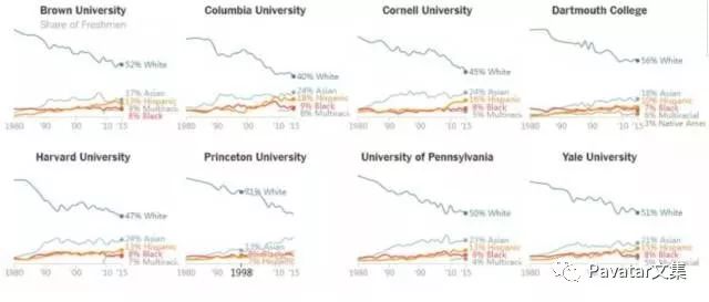 校方表示,已经收到了一些抱怨,但是通过审查,这位学生被举报的行为并没有违反我们的行为规范。 种族歧视问题微妙且复杂,但它却真实存在,每天都在发生,事实上,美国的亚裔在优质教育资源上仍然是受压制的。 以Ivy League各族裔的入学比例为例: 亚裔所占比例的曲线基本在20%左右,相较于其他族裔来讲,是很低的。 就像前一段时间闹得沸沸扬扬的哈佛招生对亚裔率设限事件: 奥斯丁· 贾是一名美籍亚裔学生,他学业优秀,多才多艺,在美国“高考”SAT考试中的分数更是接近满分,按理本能获得“常青藤”高校的青睐,却最终未能如愿。 因此,一些亚裔维权团体将哈佛大学、北卡大学教堂山分校以及得克萨斯大学奥斯丁分校等美国著名高校告上法庭。 以前的亚裔习惯沉默,但新一代的亚裔开始意识到,自己的权益应该自己主动去争取。更多的华人也看到团结的力量。 任何时候,我们拒绝被以任何方式的标准被划分。 正如诺贝尔和平奖得主马丁·路德·金所说: “我梦想有一天,我的四个孩子将在一个不是以他们的肤色,而是以他们的品格优劣来评价他们的国度里生活。”