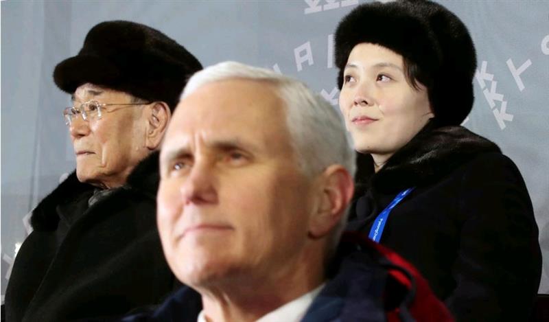 美国副总统彭斯、朝鲜名义国家元首金永南、金正恩的妹妹金与正出席平昌冬奥会的开幕式。(2018年2月9日)