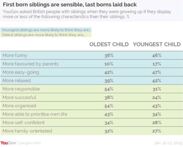 YouGov对于头生子女和幺子女的性格进行了对比 图片来源:YouGov