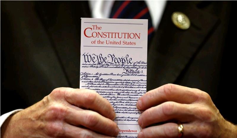 2017年6月20日,在国会上,一名国会议员手举一本美国宪法(资料图片)。